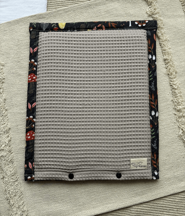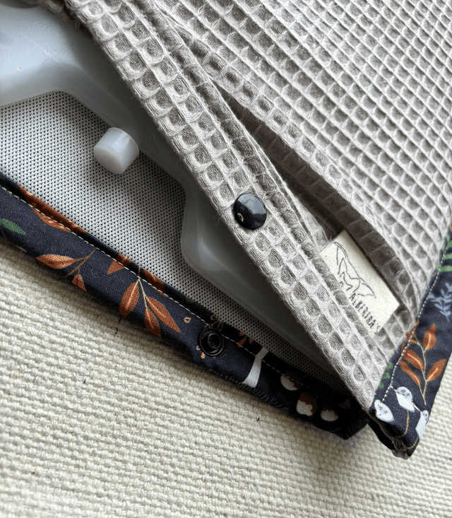 Fait main avec des matières respirantes et douces : coton, coton nid d’abeille et une mousse résille en polyester.